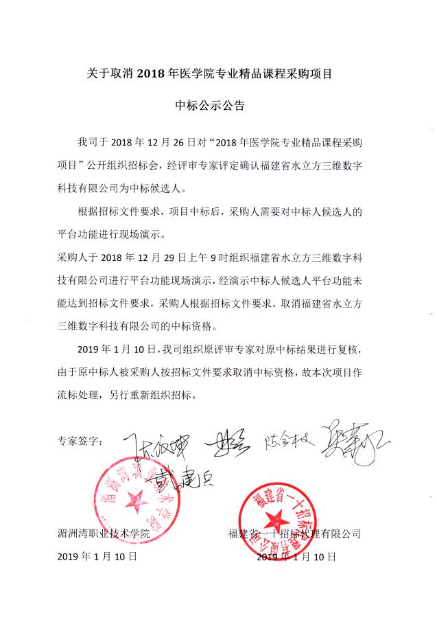 关于取消2018年医学院专业精品课程采购项目中标公示公告