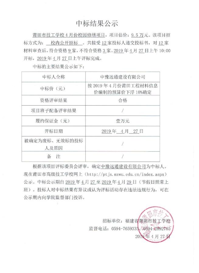 莆田市技工学校4月份校园修缮项目中标结果公示