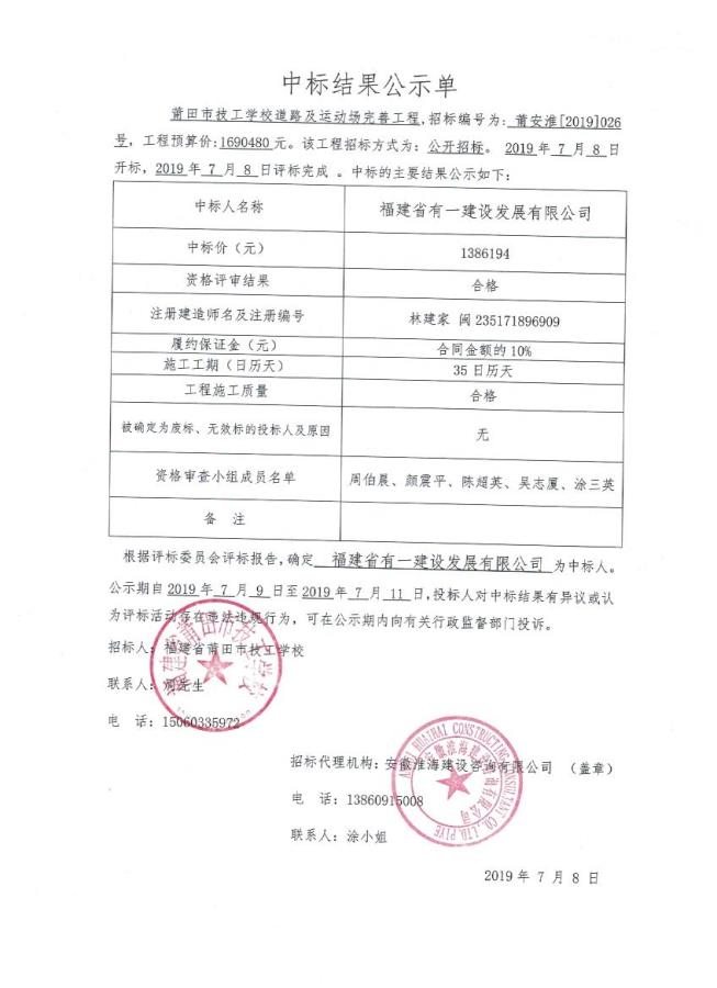 莆田市技工学校道路及运动场完善工程中标结果公示单