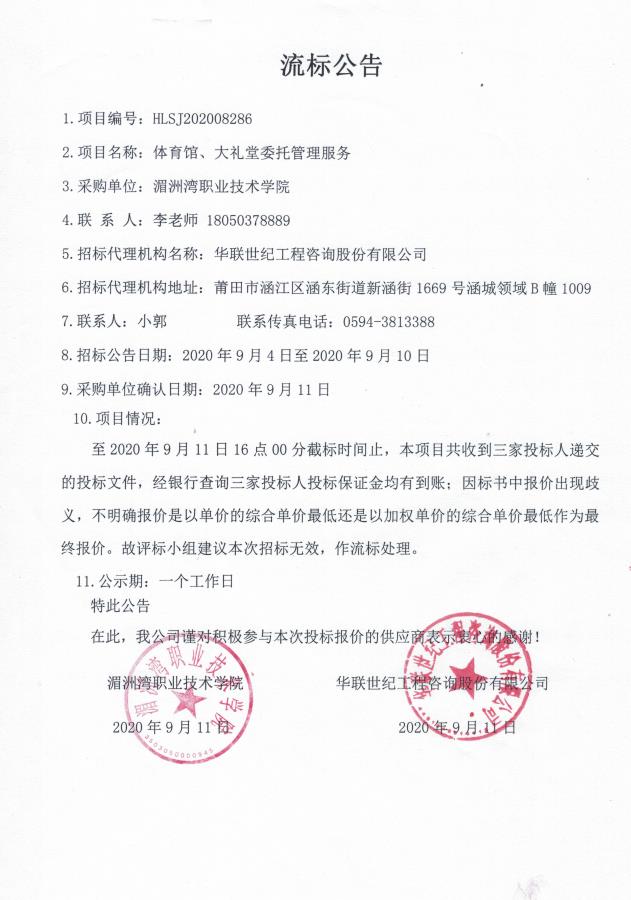 体育馆、大礼堂委托管理服务项目-流标公告(招标文件编号:HLSJ202008286)