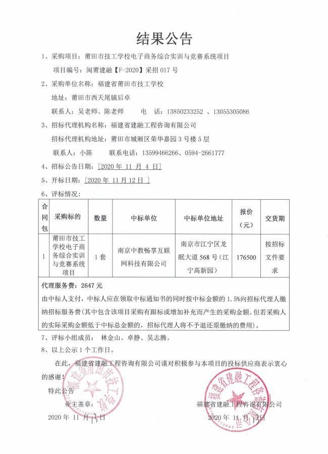 结果公告(项目编号:闽莆建融【F-2020】采招017号)